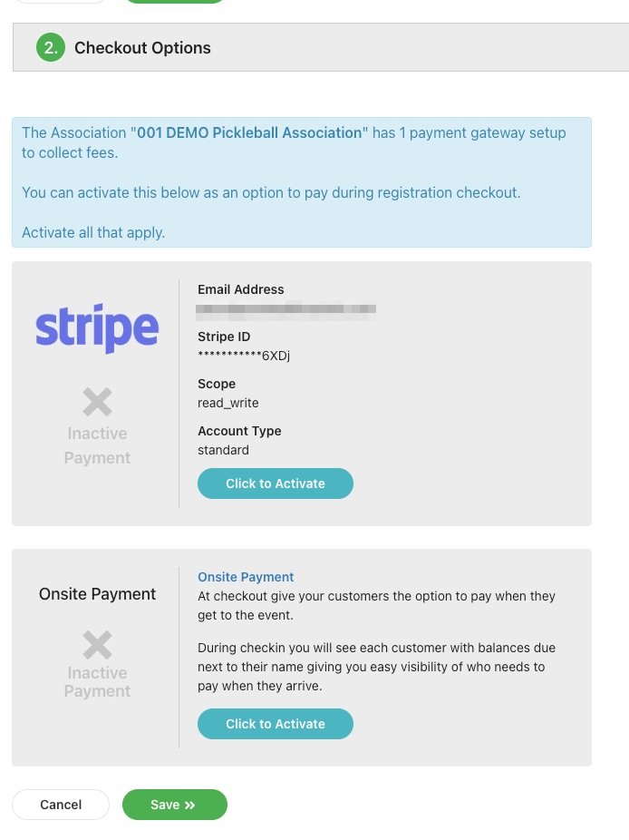 The organization or club must set up Stripe to accept online registration fees. If they have done that, the league director or manager will be able to specify that as the league Checkout Option. They also have the option of onsite payments. If more than one Checkout Option is specified, players will be able to select their preferred payment method.