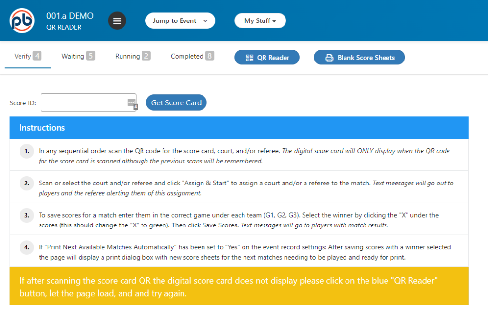 The QR code reader may be used to assign courts and referees for tournaments using the “Next Available Court” method for assigning courts.