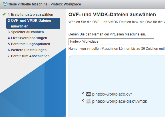 Einen Namen für die VM eingeben und die beiden Dateien auswählen.