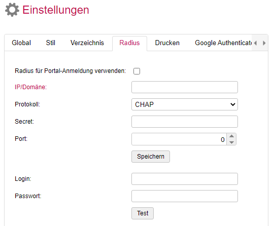 Access to the Radius server can be tested by entering a login/password