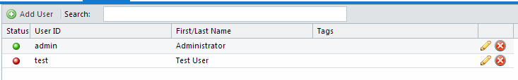 - Repeat Password = test - Click on Submit button and you will see user ‘test’ appearing with the ‘Status’ red next to it (because that user is not logged in) like this: