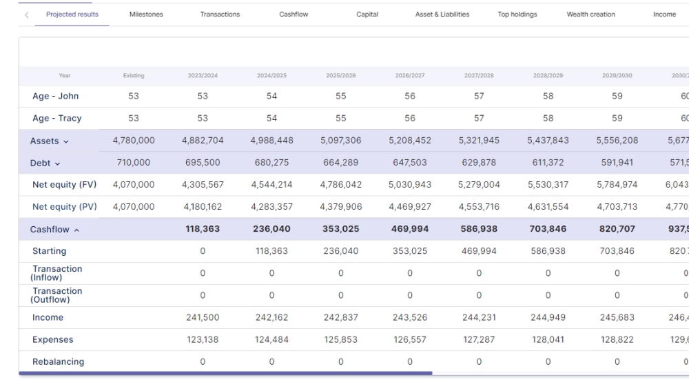 | Projected results | Table | Breaks down the projected net equity position for the life of the model. The table includes all assets, entities and debts. Cashflow transactions are also included to determine whether rebalancing has occurred year by year. |