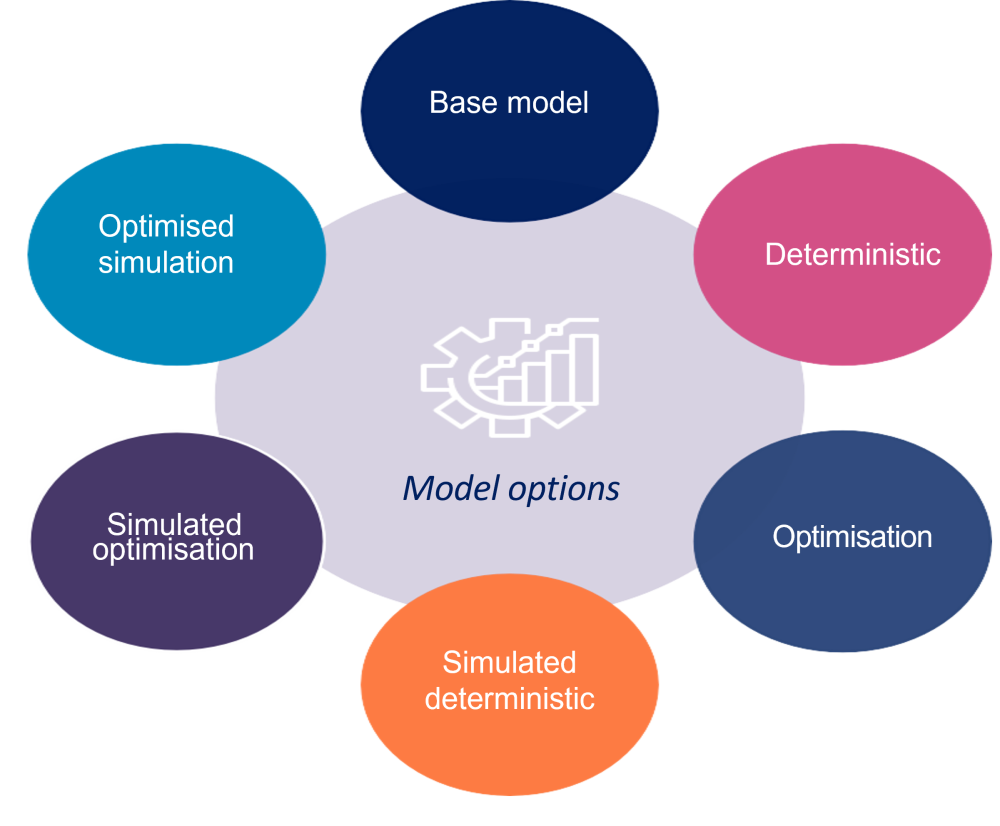 | Deterministic model | This model does not employ any optimisation techniques. Advisers can build on the base model by inserting recommendations into the model to improve the outcome. |