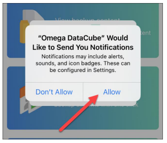 Step 7. When prompted, tap “Allow” to allow the Omega DataCube app to send you notifications. This is needed to automatically start your backups when you plug your iPhone or iPad into the Omega DataCube.