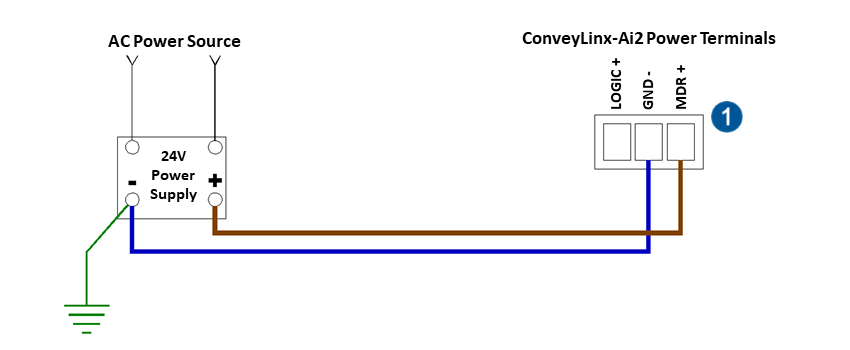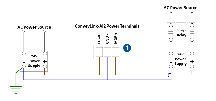 The ConveyLinx-Aiシリーズ is designed to allow for separate power connections for module logic and motor power so that these can be powered by separate power supplies. For example, the motor power supply can be switched off by an emergency stop control system so that all motors have power removed. With the motor power separately switched off; the logic power supply can remain on so that the module’s communications can remain active and report status to networked supervisory control system(s). If you use a single power supply, you only have to connect to the MDR+ power terminal and that will supply power to both the Logic and MDR.