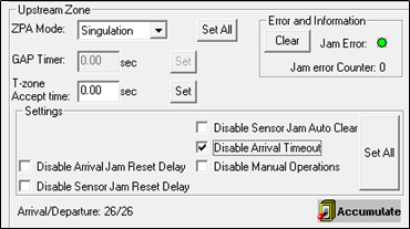 Clicking the Disable Arrival Timeout check box will prevent the discharging zone from registering an Arrival Jam condition. Upstream cartons will not wait to enter the discharging zone once a carton has left the discharging zone