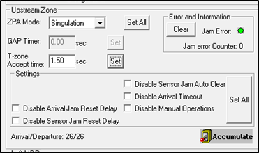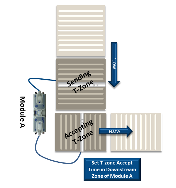 The T-Zone Accept Time is the amount of time between the leading edge of the Accepting Zone’s Sensor becoming blocked and the starting of the Accepting Zone’s motor. This time delay allows the Sending Zone enought time to fully transfer the item into the Accepting Zone.