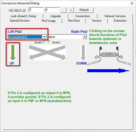 | Assuming the intermediate zone we want to accumulate is the upstream zone and the upstream zone is connected to the Left side of the module; we set the Left Aux I/O Pin 2 to Accumulate from the drop down box and make sure we click the “UP” arrow to indicate that the Left Pin 2 signal is to be associated with the Upstream Zone. When the Left Pin 2 is energized, the upstream zone will accumulate the next item that arrives | |