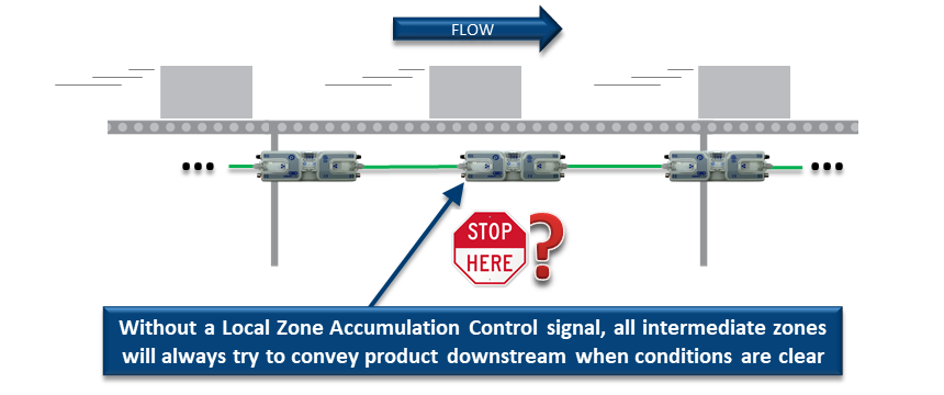 By default, and without intervention; all zones in between the most upstream and most downstream zones always try to convey items downstream if the next downstream zone is clear. To cause an intermediate zone to accumulate based upon a wired signal, you need to utilize the Aux I/O Pin 2 signal for the zone in questions as an Accumulate input.