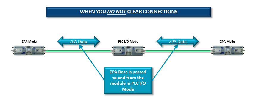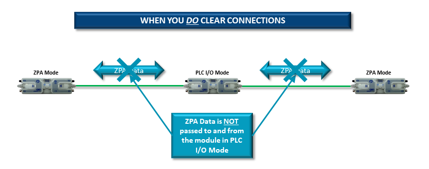 The decision to “Clear Connections” is based upon the application. When a string of modules are Auto-Configured, each successive module in the string establishes a logical upstream / downstream connection with its neighbor module’s. These connections provide the basis for the logical flow of inter-module status data for ZPA functionality. However, if a single module node within a string of ZPA configured nodes needs to be utilized in PLC I/O mode, these logical connections can remain in place and be used to PLC programmer’s advantage.