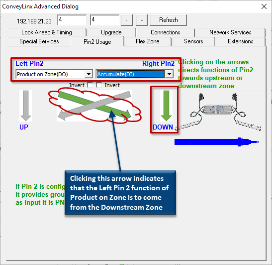 | Assuming the most downstream zone is connected to the right side of the module; we set the Right Pin 2 to Accumulate from the drop-down box and make sure we click the “DOWN” arrow to indicate that the Right Pin 2 signal is to be associated with the Downstream Zone. Similarly, we select Product on Zone for the Left Pin 2 signal and click the diagonal arrow to indicate that this signal is to reflect the status of the Downstream zone | |
