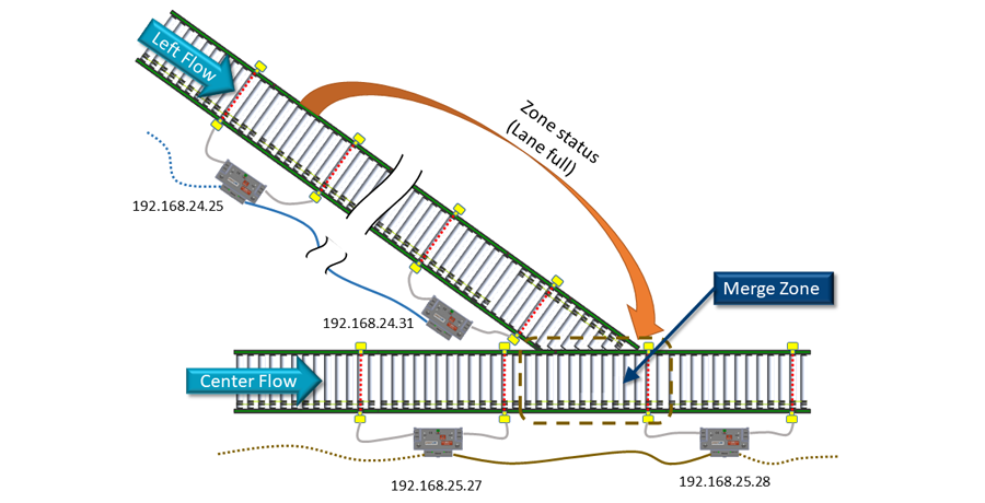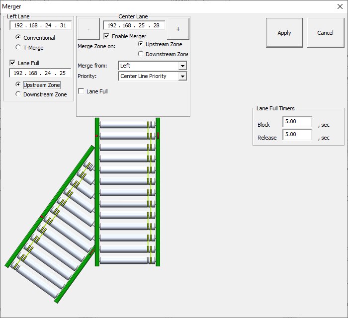 The Merge Zone is the upstream zone of ConveyLinx-Aiシリーズ 192.168.25.28 and the Left Line’s most downstream node is 192.168.24.31 and we want this line to have the Merge Line Full function enabled. On the Left Line, we would like for the upstream zone of ConveyLinx-Aiシリーズ 192.168.24.25 to be the Merge Line Full function’s Monitor Zone. We would also like that once the Monitor Zone has been accumulated (or blocked) for 5 seconds, we want the Left Line to release for 5 seconds and then return the priority to the Center Line. Here is the ConveyMerge Configuration Screen with the values entered for this example: