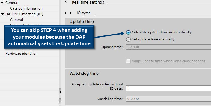 The DAPs for Integrated PLC Topology Configuration are already pre-configured with the lowest recommended Update time for the given functionality. This means that you can skip STEP 4 when adding your modules.