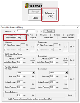 | The ConveyLinx Advanced Dialog pops up over the Main screen display and defaults to show the Look Ahead & Timing tab | ![]() |