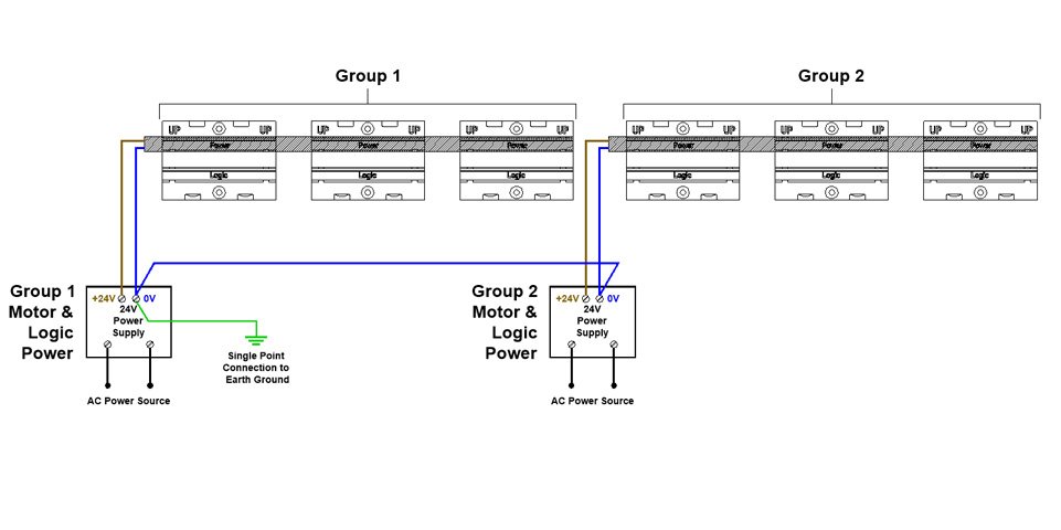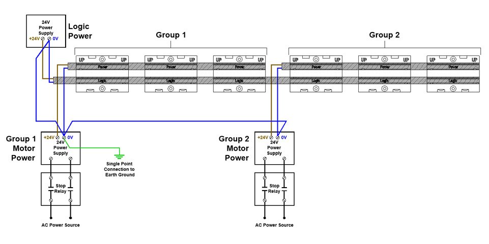 This diagram depict the same example shown above with the exception of the power supplies being included in an externally controlled switching circuit such as would be used for an E-Stop.