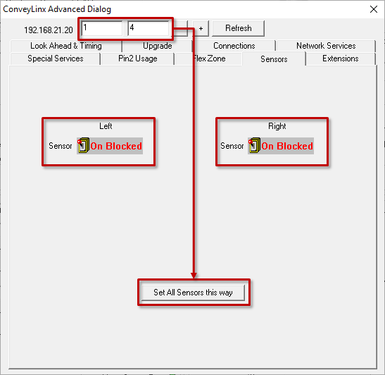 The Sensors tab displays the status of how the two sensor signals were configured during the Auto Configuration Procedure. If for some reason one or more of the sensors was not configured properly during the Auto Configuration Procedure; for example they were not aligned with their reflector or there was an obstruction blocking the sensor at the time the procedure was performed, the Sensors Tab will allow you to change the sensor’s configuration without requiring you to re-perform the Auto Configuration Procedure for the entire subnet. For example, if all the sensors on the system are light energized normally open then the corresponding zone’s sensor graphic on this tab will show Off Blocked.