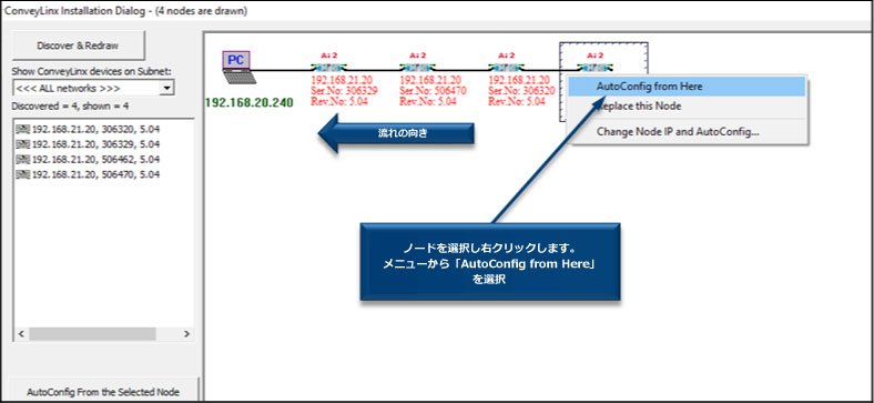 | 最上流のConveyLinxがPCから最も遠い場合、それを選択して右クリックし、ここから AutoConfig を選択する。 これで手順開始になる。 | ![]() |