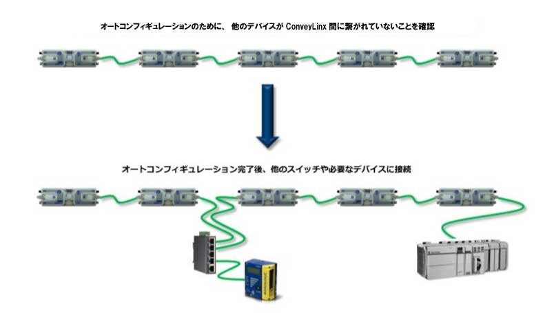 - ConveyLinx-Aiシリーズ の一連の列に、他のイーサネットデバイスやスイッチが接続されてないことを確認すること。 オートコンフィギュレーション が完了し成功した後に、必要に応じて他のデバイスやスイッチをイーサネットの列に割り込ませることが出来る。