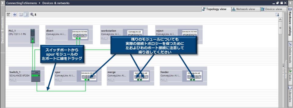 第1サブネットと同様に、スイッチから spur モジュール、 spur モジュールから merge モジュールの右ポートへの接続をクリック&ドラッグします。 merge モジュールの左ポートを feeder モジュールの左ポートに接続します。