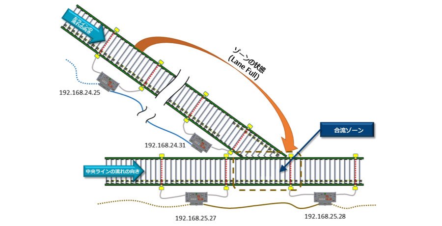 合流ゾーン は ConveyLinx-Aiシリーズ の上流ゾーン192.168.25.28で、 左ライン の最下流ノードは192.168.24.31です。そしてこのラインで 合流ラインフル 機能を有効にします。 左ライン では、 ConveyLinx-Aiシリーズ の上流ゾーン192.168.24.25を合流ラインフル機能の モニターゾーン にします。