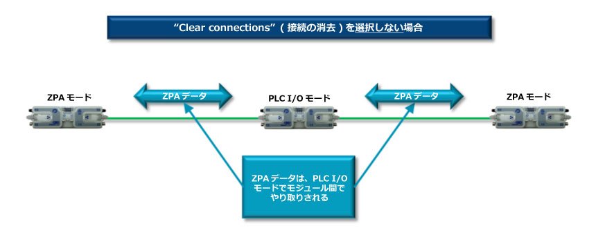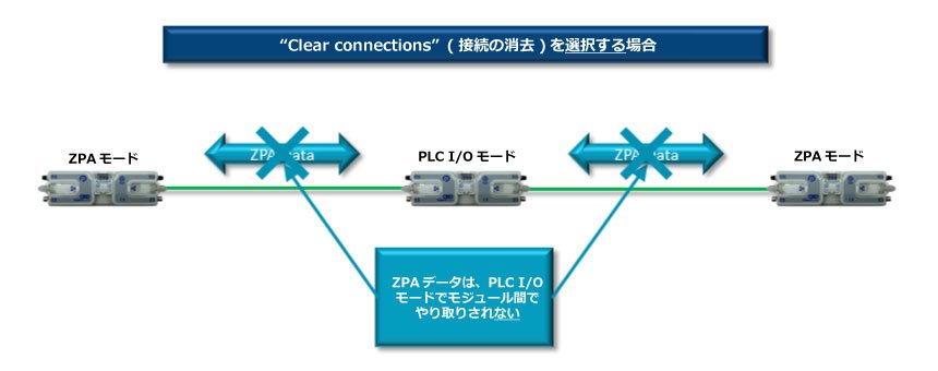 “Clear Connections”の決定はアプリケーションに基づいて行われます。ConveyLinxの配列が自動設定されると、その配列にあるConveyLinxは隣接するConveyLinxと論理的な上流/下流接続を確立します。これらの接続はZPA機能のモジュール間ステータスデータの論理的流れの基礎となります。しかし、ZPAで構成されたノード配列内の1つのConveyLinxノードをPLC I/Oモードで使用する必要がある場合、これらの論理接続をそのままにしてPLCプログラマーに好都合になるよう使用することができます。
