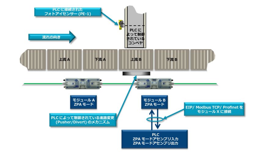 この例では、PLCを使用して単純な進路変更のメカニズムを制御し、搬送物をZPAゾーンから進路変更させてそのトラッキングを捉える方法を示します。この例ではまた、PLCの下流到着設定機能を使用して、搬送物がZPAゾーンから進路変更レーンに移動する時に、搬出しているConveyLinxがジャム状態を発生させないようにする方法を図で解説します。PLCは モジュールB に接続されます。