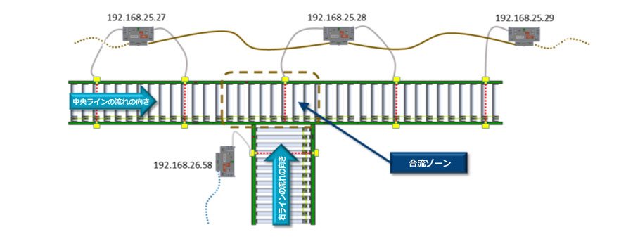合流ゾーン はConveyLinxの上流ゾーン192.168.25.28で、 右ライン の最下流 ConveyLinx-Aiシリーズ は192.168.26.58です。これらの値を入力した ConveyMerge 設定画面 は以下の通りです。