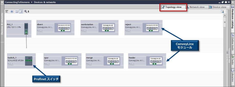 この例では前述の ConveyLinxの追加例 の章で説明したのと同じ方法で、これらをネットワークに追加します。この例ではスイッチを使用しているため、カタログからProfinetスイッチを選択する必要があります。ここでは、SCLANCE XF204 4ポートスイッチを選択しました。これがそのProfinetスイッチとConveyLinxを含む、トポロジーに追加された全アイテムの表示図です。