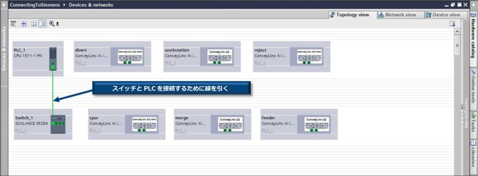 トポロジー接続を行うには、PLC上の小さな接続の角からスイッチのポートの1つをクリック&ドラッグします。