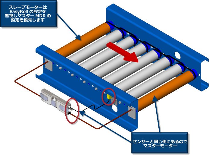通常、 オートコンフィギュレーション 手順 を実行すると、ConveyLinx-Ai2(-Ai3)は初期設定としてZPAモードで構成されます。1つのセンサー(左または右)が接続され、2つのモーターが接続されている場合、ConveyLinxは自動的に1つの論理ゾーンとして構成され、両方のモーターを同時に操作します。センサーが接続されている側(左または右)は、その側のモーターをマスターとして自動的に構成し、もう一方のモーターをスレーブとして構成します。マスターモーターのPIレギュレーションとPWM出力は、「スレーブ」モーターにも適用されます。