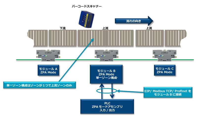 ZPA機能が組み込まれているため、搬送物が モジュール A の搬出ゾーンを離れると、 モジュール A は モジュールB から搬送物到着の確認を受け取るまで待機します。 新しい搬送物が モジュール A 、 に到着すると、この到着確認が行われるまで集積されます。 モジュールB は単一の長いゾーンであるため、 モジュール B の上流ゾーン(2ゾーンとして構成されている場合)であった場所は、 搬送物が モジュールB に集積される時は基本的に空いたままになります。これはバーコードスキャナーがあるエリアです。この構成では、 モジュールB への新しい到着はバーコードリーダーからの最後のスキャンに関連つけられた搬送物であることが確実になります。この例では、PLCは モジュールB との接続を確立してから、 基本的な集積と搬送 の説明に従いゾーン制御を行う必要があります。