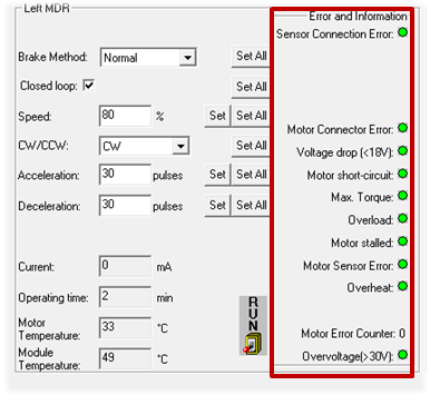 EasyRoll では、左と右のモーターの各メイン画面に Run ボタンがあります。これらは機能の確認と診断のために、モーターを一時的に動かすために使用されます。