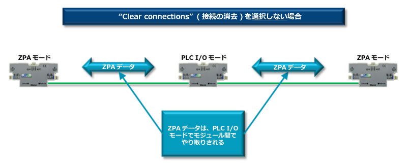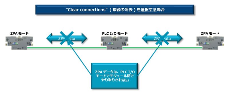“Clear Connections” の決定はアプリケーションに基づいて行われます。ConveyLinx-ECOの配列が自動設定されると、その配列にあるConveyLinx-ECOは隣接するConveyLinx-ECOと論理的な上流/下流接続を確立します。 これらの接続はZPA機能のモジュール間ステータスデータの論理的流れの基礎となります。しかし、ZPAで構成されたノード配列内の1つのConveyLinx-ECOのノードをPLC I/Oモードで使用する必要がある場合、これらの論理接続をそのままにしてPLCプログラマーに好都合になるよう使用することができます。
