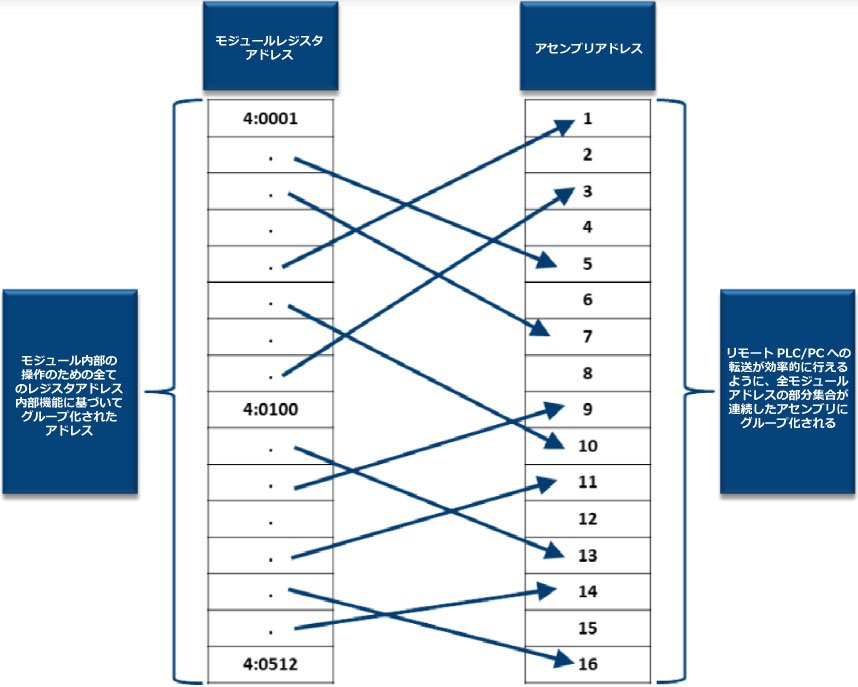アセンブリ はデータの関連性に基づいて512 のモジュールレジスタのサブネットをグループ化したものです。例えば、ZPA入力アセンブリは512のモジュールレジスタのうち、ZPA入力に関連する21個を纏めてグループにしたものです。モジュールの512のレジスタ内からの関連データは必ずしも連続したアドレス位置にあるとは限らず、512アドレス全体のあちこちに散在します。 アセンブリ がそれらを纏めて分類することにより、一度に効率よく読み取ることができます。