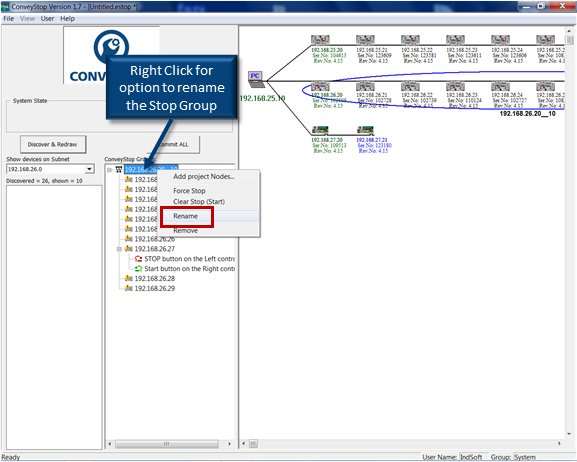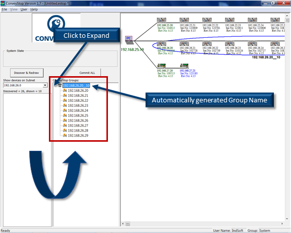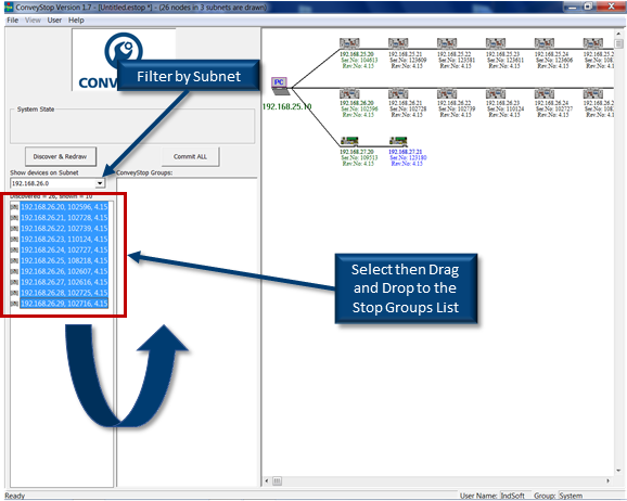 Then drag the selection into the ConveyStop Groups list window as shown. This creates a Stop Group from the selected modules and automatically generates a group name.