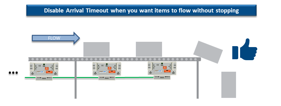| Clicking the Disable Arrival Timeout check box will prevent the discharging zone from registering an Arrival Jam condition. Upstream cartons will not wait to enter the discharging zone once a carton has left the discharging zone | |