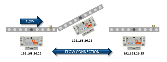 | In this example the module on the lifting or gate portion of conveyor has an MDR and no photo-sensors. Normal operation when the gate is down is for the MDR on the gate to run when its immediate downstream zone runs so as to create “one long logical zone”. This means that if a carton is accumulated on the upstream zone of Node 192.168.26.24; a carton arriving at the downstream zone of Node 192.168.26.22 will stop and accumulate and no loads will ever be logically accumulated or stopped on the gate portion. In order to accomplish this, all we need to do is instruct Node 192.168.26.23 to be an Extension of its downstream neighbor Node 192.168.26.24 | ||