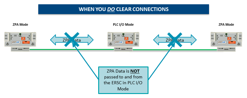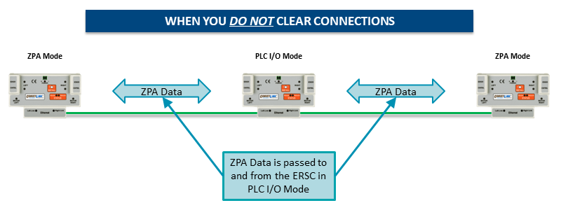 The decision to “Clear Connections” is based upon the application. When a string of ERSC modules are Auto-Configured, each successive ERSC in the string establishes a logical upstream / downstream connection with its neighbor ERSC’s. These connections provide the basis for the logical flow of inter-module status data for ZPA functionality. However, if a single ERSC node within a string of ZPA configured nodes needs to be utilized in PLC I/O mode, these logical connections can remain in place and be used to PLC programmer’s advantage.