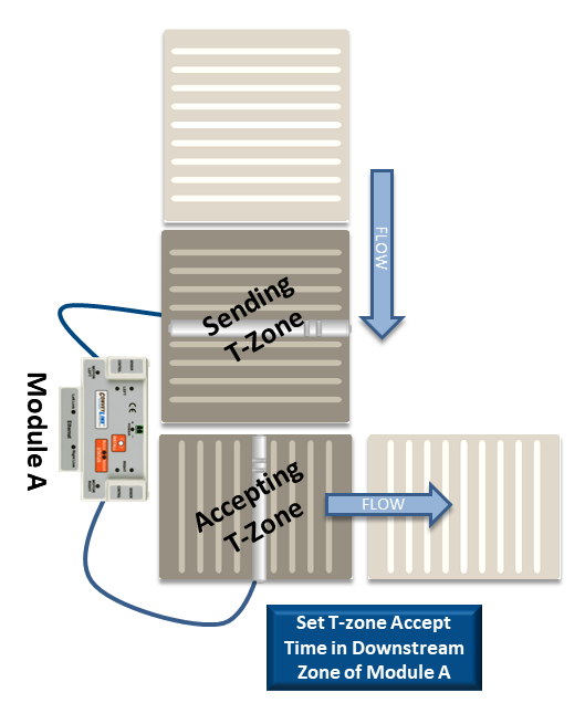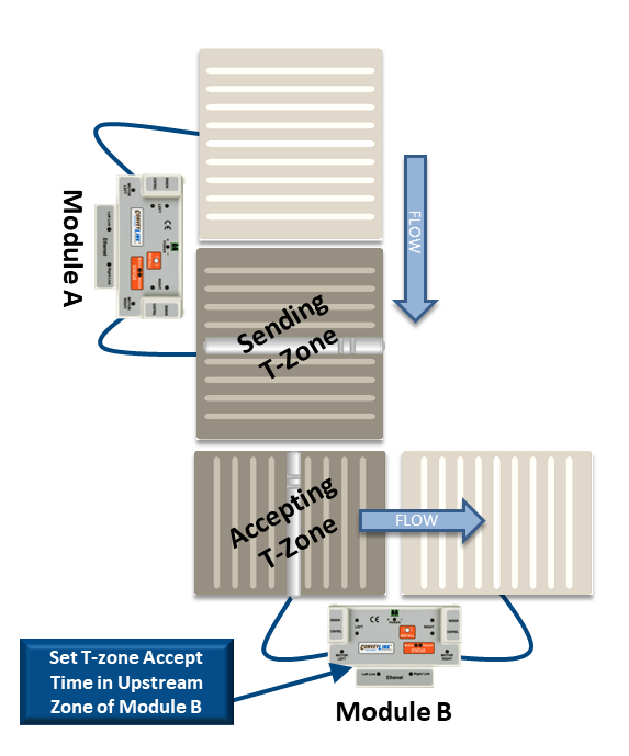 In conveyor applications, transferring a carton at a right angle from one conveyor to another often requires special lifting and lowering mechanisms. In certain applications, one conveyor can simply drive its carton off of its downstream zone directly onto the upstream zone of another conveyor that is perpendicularly oriented. This type configuration is commonly defined as a T-Zone arrangement. ConveyLinx contains the logic to control a T-Zone arrangement without requiring any external control interface or programming.