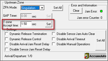 | Enter the value, for example 0.200 for 200 milliseconds and click the Set button. Whether to change the Upstream Zone or Downstream Zone value on the main screen is dependent upon which zone is the accepting zone. In our example we entered 1.5 seconds | |