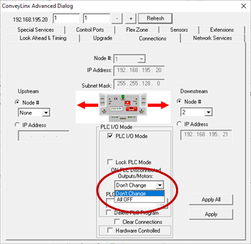 When changing the mode of a given ConveyLinx to PLC I/O mode in EasyRoll, you are given the option to select the behavior of the ConveyLinx’s outputs upon loss of communications with the PLC.