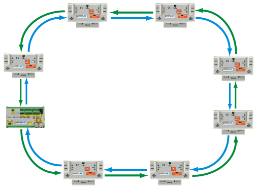 The ability to respond to Stop Commands and Start Commands is built in to every ERSC and CNIP module. The activation of the ConveyStop function requires the ConveyStop PC software package to first define one or more Stop Groups of modules and then enable the ConveyStop functions in these modules. When enabled, the modules create 2 logical network connection rings within their configured Stop Group as shown:
