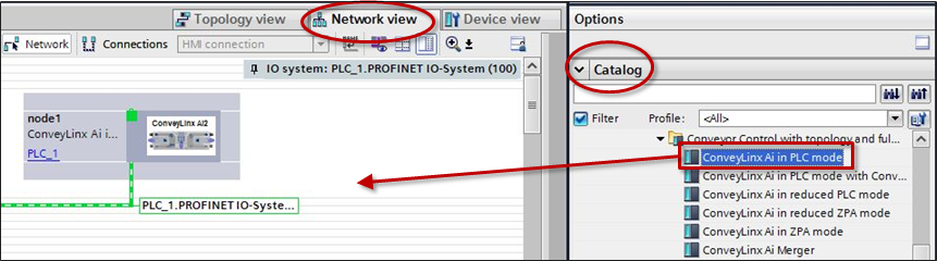 | From the Catalog window, drag and drop the ConveyLinx-Ai DAP into the Network View window | |
