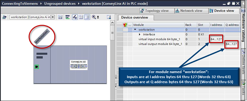| From Network View, locate the module workstation, right click and select Device configuration and from Device view expand the window from the right to display the Device overview. This will show you the I and Q address byte locations in memory that were assigned when you added the workstation module to you project. As you can see, the workstation module’s I and Q are located in bytes 64 thru 127 respectively. | |