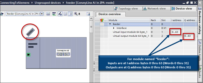 | From Network View, locate the module feeder, right click and select Device configuration and from Device view expand the window from the right to display the Device overview. This will show you the I and Q address byte locations in memory that were assigned when you added the module to you project. As you can see, the feeder module’s I and Q are located in bytes 0 thru 63 respectively. | |