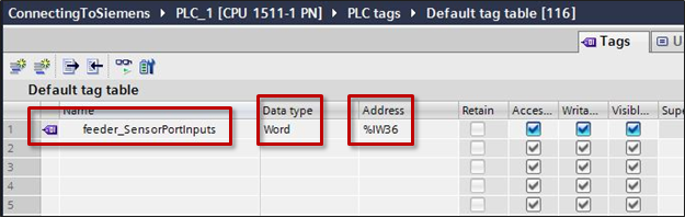 | From our Default tag table, create a new tag and let’s call it feeder_SensorPortInputs. Select Word as the Data type and enter %IW36 for the Address. | |