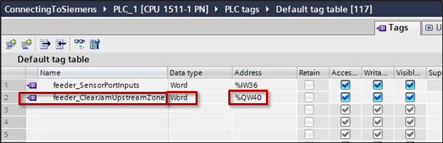 | From our Default tag table, create a new tag and let’s call it feeder_ClearJamUpstreamZone. Select Word as the Data type and enter %QW40 for the Address. | |
