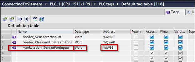 | From our Default tag table, create a new tag and let’s call it workstation_SensorPortInputs. Select Word as the Data type and enter %IW66 for the Address. | |