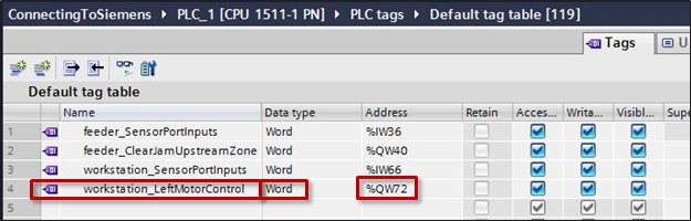 | From our Default tag table, create a new tag and let’s call it workstation_LeftMotorControl. Select Word as the Data type and enter %QW72 for the Address. | |