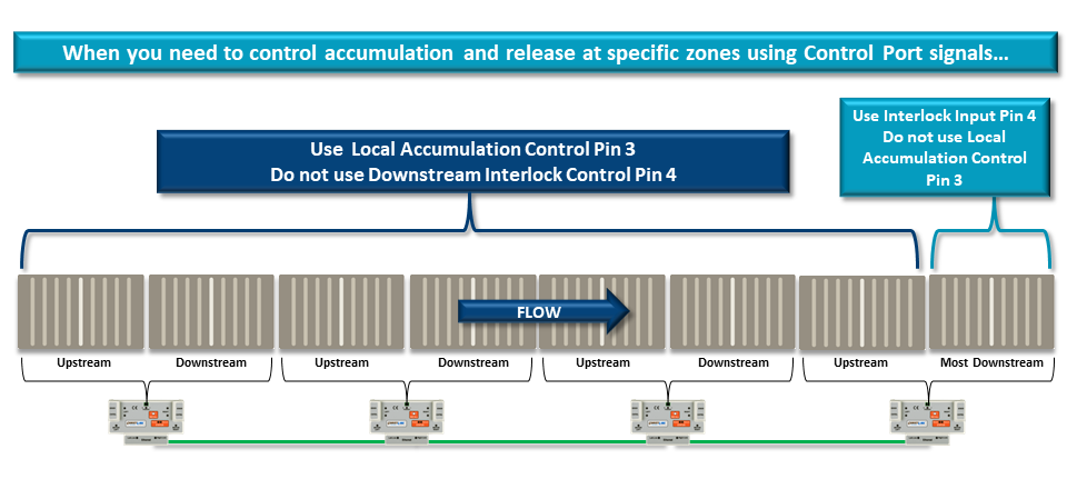 By default, energizing the Interlock Signal Pin 4 on a Control Port on the Downstream side of a ConveyLinx will cause that zone to accumulate an item when it arrives on the zone sensor. You get the same result if you energize the Local Accumulate Signal on Pin 3. So if all you want to do is accumulate a zone, which signal should you use and does it make any difference? The answer is yes it can make a difference